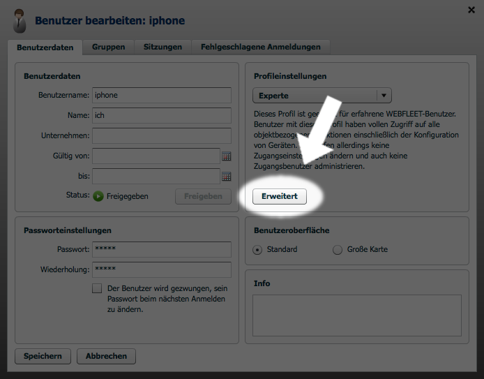 Klicke auf „Erweitert“ in den Profileinstellungen. Für den Benutzer, mit dem du gerade angemeldet bist, ist dieser Button ausgegraut. Verwende einen anderen Benutzer, um dessen Rechte zu ändern.